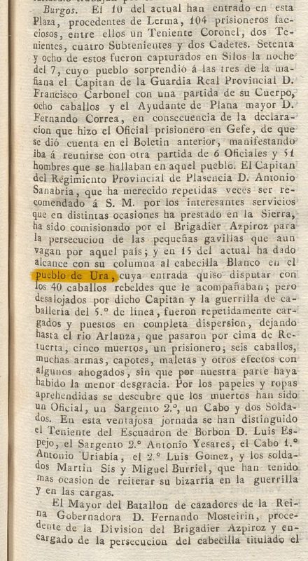 Una comunicación publicada el 16 de enero de 1838 recoge oficialmente los resultados de las operaciones militares desarrolladas en la sierra burgalesa bajo el mando del brigadier Javier Azpiroz. En ella se informa de la derrota de varias facciones carlistas, entre ellas la del cabecilla Blanco, batida en Ura el 15 de diciembre de 1837 por fuerzas al mando del capitán Antonio Sanabria. El texto decía: El de Burgos con fecha 22 dice lo siguiente: Tengo el honor de elevar á conocimiento de V. E. para su satisfaccion y la de S. M. el brillante resultado que han obtenido la faccion y las últimas operaciones militares de esta sierra practicadas bajo el mando y acertada direccion del acreditado brigadier don Javier Azpiroz. La faccion del titulado brigadier Marron (...) ha sido completamente destrozada (...) La del cabecilla Blanco fue batida y dispersa el 15 por el mismo Sanabria <b>en el pueblo de Ura</b> con pérdida de un oficial, un sargento y dos hombres muertos, seis prisioneros y captura de seis caballos con sus monturas, armas y otros efectos. La del Pasiego tambien lo fue el mismo dia (...) La noticia confirma que Ura fue escenario directo de una acción militar durante la Primera Guerra Carlista, integrada en una operación más amplia de persecución de partidas en la sierra. Diario constitucional de Palma de Mallorca: Número 16 - 1838 enero 16 https://prensahistorica.mcu.es/es/catalogo_imagenes/grupo.do?path=546342&posicion=2&presentacion=pagina ------ Yo recuerdo que de pequeño me hablaban en Ura de una canción que existió sobre una guerra que hubo a la entrada del Carrascal (un monte de Ura) donde hubo muchos muertos. Pero nadie recordaba la letra. ¿Esta noticia tendrá relación con esto?