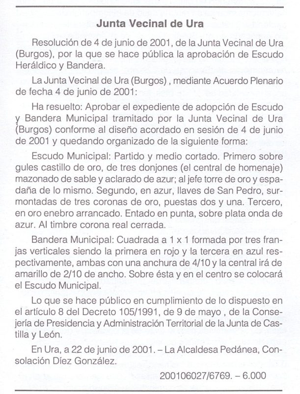 Escudo partido, medio cortado y entado en punta. Primero, de gules, castillo de oro, donjonado, mazonado de sable y aclarado de azur, en jefe torre e iglesia de oro. Segundo, de azur, dos llaves de plata y oro puestas en aspa, en jefe tres coronas de oro bien ordenadas. Tercero, de oro, árbol de sinople. Al timbre corona real de España. Bandera cuadrada formada por tres franjas verticales siendo la primera en rojo y la tercera en azul respectivamente, ambas con una anchura de 4/10 y la central irá de amarillo de 2/10 de ancho. Sobre ésta y en el centro se colocará el escudo municipal. <u>ANOTACIÓN</u> La Diputación Provincial de Burgos encargó al Cronista Oficial Fray Valentín de la Cruz la elaboración y regularización de numerosos escudos y banderas de la provincia. Sus propuestas, fundamentadas históricamente y ajustadas a la heráldica tradicional, dieron forma a la mayor parte de los símbolos municipales hoy vigentes. Lo cierto es que Ura ya tenía un escudo que aparecía en un viejo sello que había en el Ayuntamiento. Un castillo flanqueado por dos sabinas, sobre un monte.