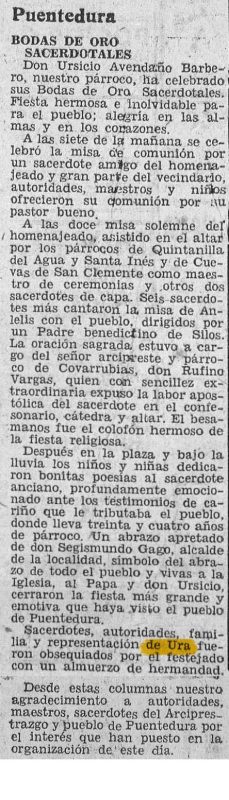 don Ursicio Avendaño Barbero, nuestro párroco, ha celebrado sus Bodas de Oro Sacerdotales. [...] Sacerdotes, autoridades, familia y representación de Ura fueron obsequiados por el festejado con un almuerzo de hermandad.