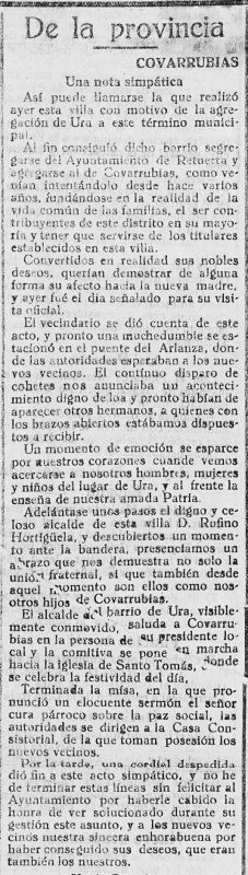 El 23 de diciembre de 1935, pocos meses antes del inicio de la Guerra Civil, una crónica titulada “Un domingo bajo la lluvia” describía una excursión por la sierra y el valle del río Ura. El texto recoge la hoz, el desfiladero y la visión del pueblo al anochecer, ofreciendo una imagen paisajística anterior al conflicto de 1936. La crónica decía: Un hombre escéptico puede acortar lo menos un cuarto de hora la legua a <b>la hoz de Ura</b>, atravesando á derecho esa fuerte loma que hay detrás del pueblo —nos dijo un tratante en telas cuando abrigados al amor de la lumbre, nos guarecimos para descansar y comer en una cocina del pueblo de Tejada—. Yo sigo el camino de ustedes —añadió—, pero con caballería y carga debo atajar por la senda más larga. <b>El río Ura</b> ha entrado en un desfiladero, formando un valle estrecho y sinuoso de poco más de una legua de extensión. Nosotros hemos bordeado también a la par que el río, y el camino con fango de la hoz, guiaba nuestros pasos. Atravesamos Castroceniza y al hacerse de noche, dimos vista a <b>Ura</b>. El aire impregnado de humedad condensaba el humo de las chimeneas en vapores violetas, de transparentes tonalidades, que se cernían sobre el pueblecito encuadrado entre sus dos paredones de peñascos. Junto al torrente los nogales seculares que pueblan toda la extensión del valle inclinaban sus ramas monstruosas; algunas tan grandes, que llegaban a hacer arco de puente sobre el río. <u>ANOTACIÓN</u> El artículo constituye un testimonio literario y paisajístico de Ura en vísperas de la Guerra Civil, cuando el valle era percibido como enclave agreste, húmedo y encajado entre peñascos. Narración publicada el 1 de enero de 1936 en Diario de Burgos https://prensahistorica.mcu.es/es/catalogo_imagenes/grupo.do?path=1000447430&posicion=6&presentacion=pagina