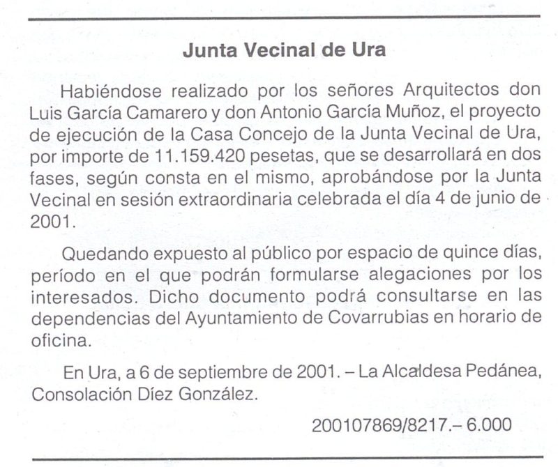 Aprobación del proyecto de ejecución de la Casa Concejo de la Junta Vecinal de Ura, por importe de 11.159.420 pesetas, realizado por los señores Arquitectos don Luis García Camarero y don Antonio García Muñoz.
