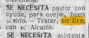 Se necesita pastor con ayuda, para ovejas, buen sueldo.- Tratar, en Ura, con el Alcalde.