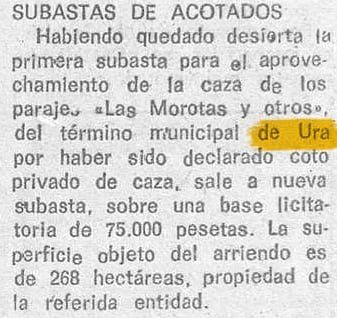 Habiendo quedado desierta la primera subasta para el aprovechamiento de la caza de los parajes "Las Morosas y otros" del término municipal de ura por haber sido declarado coto privado de caza, sale una nueva subasta, sobre una base de licitación de 75.000 pesetas. la superficie objeto del arriendo es de 268 hectáreas, propiedad del a referida entidad.