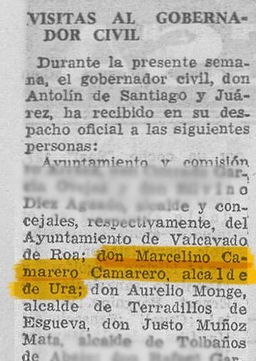 Durante la presenta semana, el gobernador civil [...] ha recibido en su despacho oficial a las siguientes personas: [...] don Marcelino Camarero Camarero, alcalde de Ura.