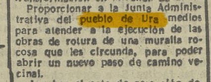 Proporcionar a la Junta Administrativa del pueblo de Ura medios para atender a la ejecución de las obras de rotura de una muralla rocosa que les circunda, para poder abrir un nuevo paso de camino vecinal.