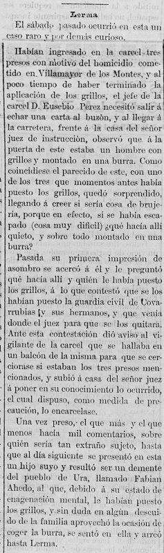 En 29 de Agosto último se fugó de la cárcel de Lerma, Daniel Ahedo, natural del lugar de Ura, contra cuyo sugeto se sigue causa criminal;